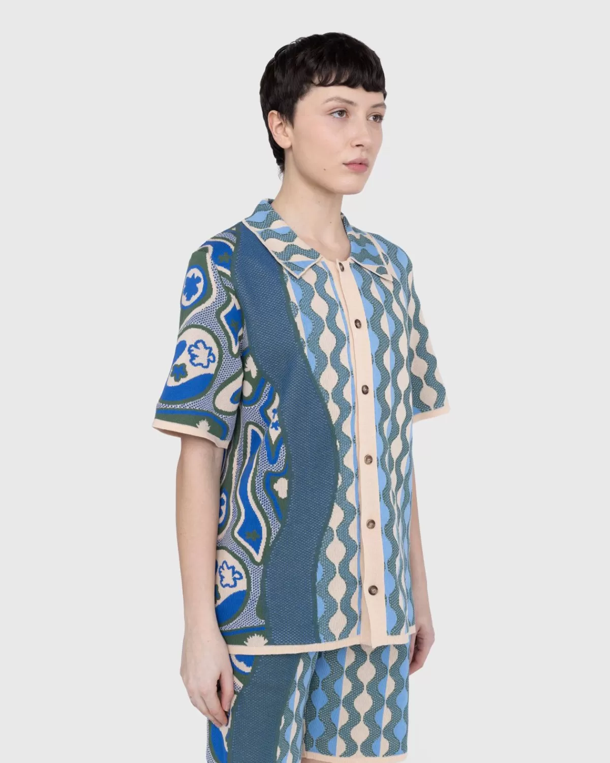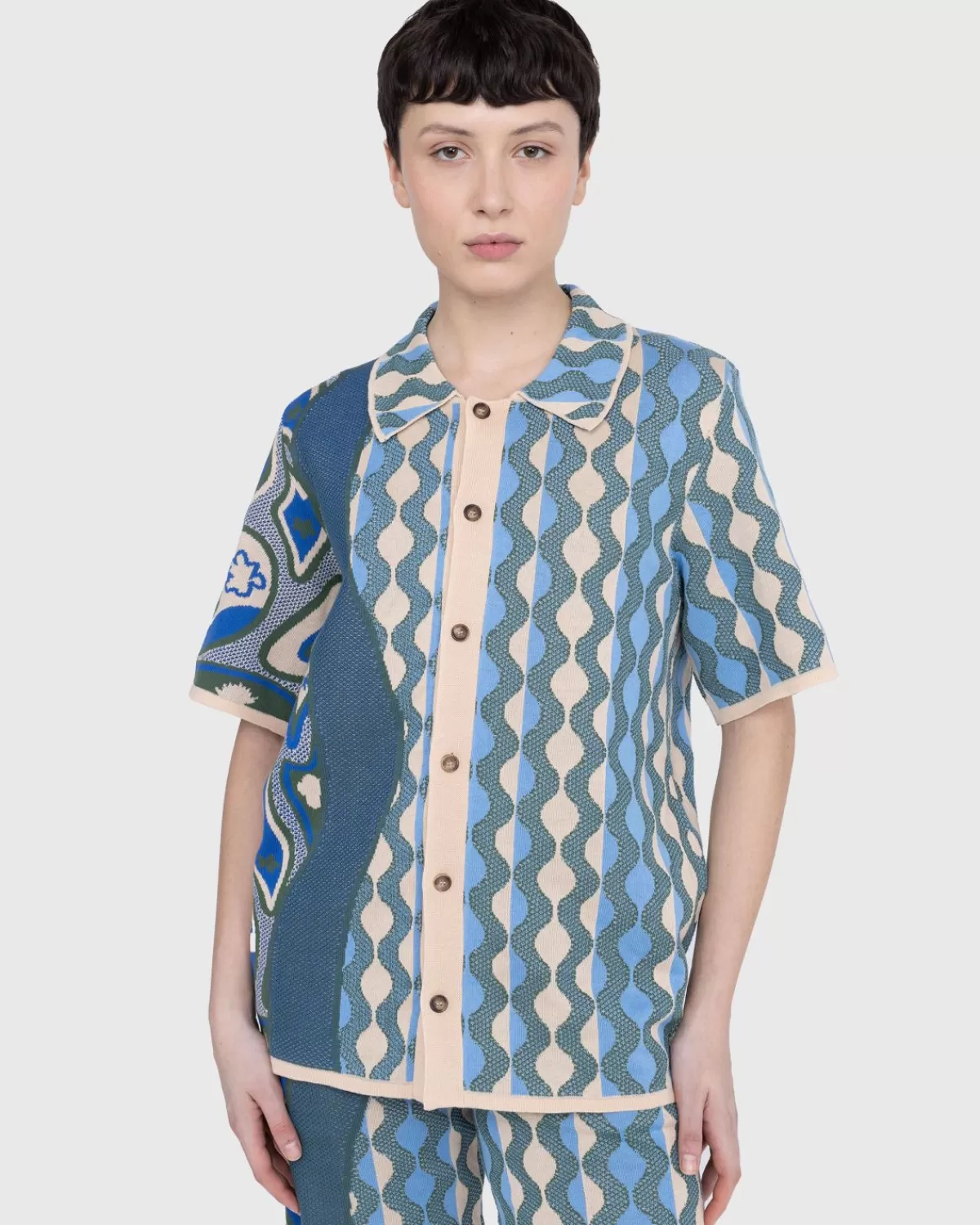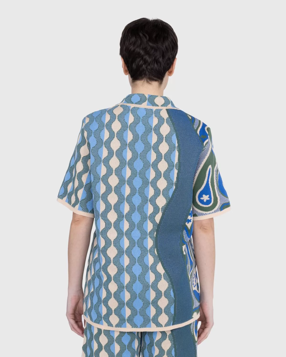 Het Katrina Knit Shirt Bevat Seizoensgebonden Ahluwalia-Ontwerpen Die Zijn Geïnspireerd Op De Indiaas-Nigeriaanse Erfenis Van De Ontwerper. Het Jacquardgebreide Overhemd Is Gemaakt Van 100% Katoen En Heeft Contrasterende Golvende Lijnen Die Worden Afgewisseld Met Een Grote Patchwork-Achtige Streep Die Leidt Naar Een Ander Uitnodigend Patroon, Waardoor Je Gegarandeerd Opvalt, Waar Je Ook Bent.