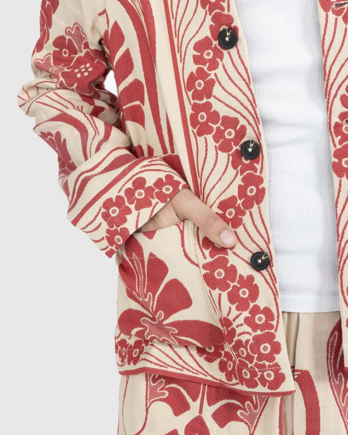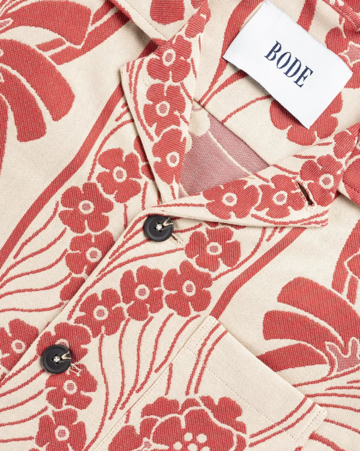 Nouveau Monstera Is Een Opvallende Overshirtstijl Uitgevoerd In Een Zware Jacquard. Geïnspireerd Door Een Tafelkleed Uit De Jaren Veertig, Is Het Patroon Op Zijn Beurt Gereproduceerd Voor Het Kledingstuk, Met Koraalmonsterabladeren Op Een Lichtbruine Achtergrond. Het Kledingstuk Heeft Een Gespreide Kraag, Een Knoopsluiting Aan De Voorkant En Een Drietal Zakken, En Is Gesneden Voor Een Boxy, Cropped Pasvorm.