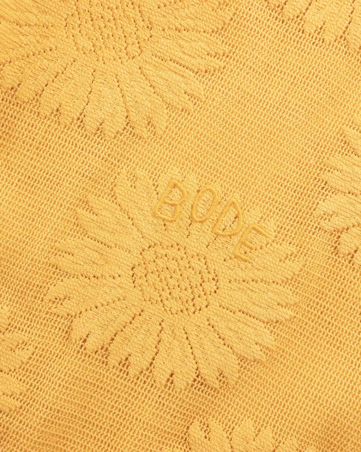 Bode’S Sunflower Lace Shirt Is Geïnspireerd Op Vintage Gordijnen En Komt In Een Heldere, Uitnodigende Gele Tint. De Kanten Top Met Korte Mouwen Is Gemaakt Van Een Mix Van Katoen En Nylon En Is Gedetailleerd Met Een Los Gebreide Constructie En Overal Verspreide Zonnebloemen.