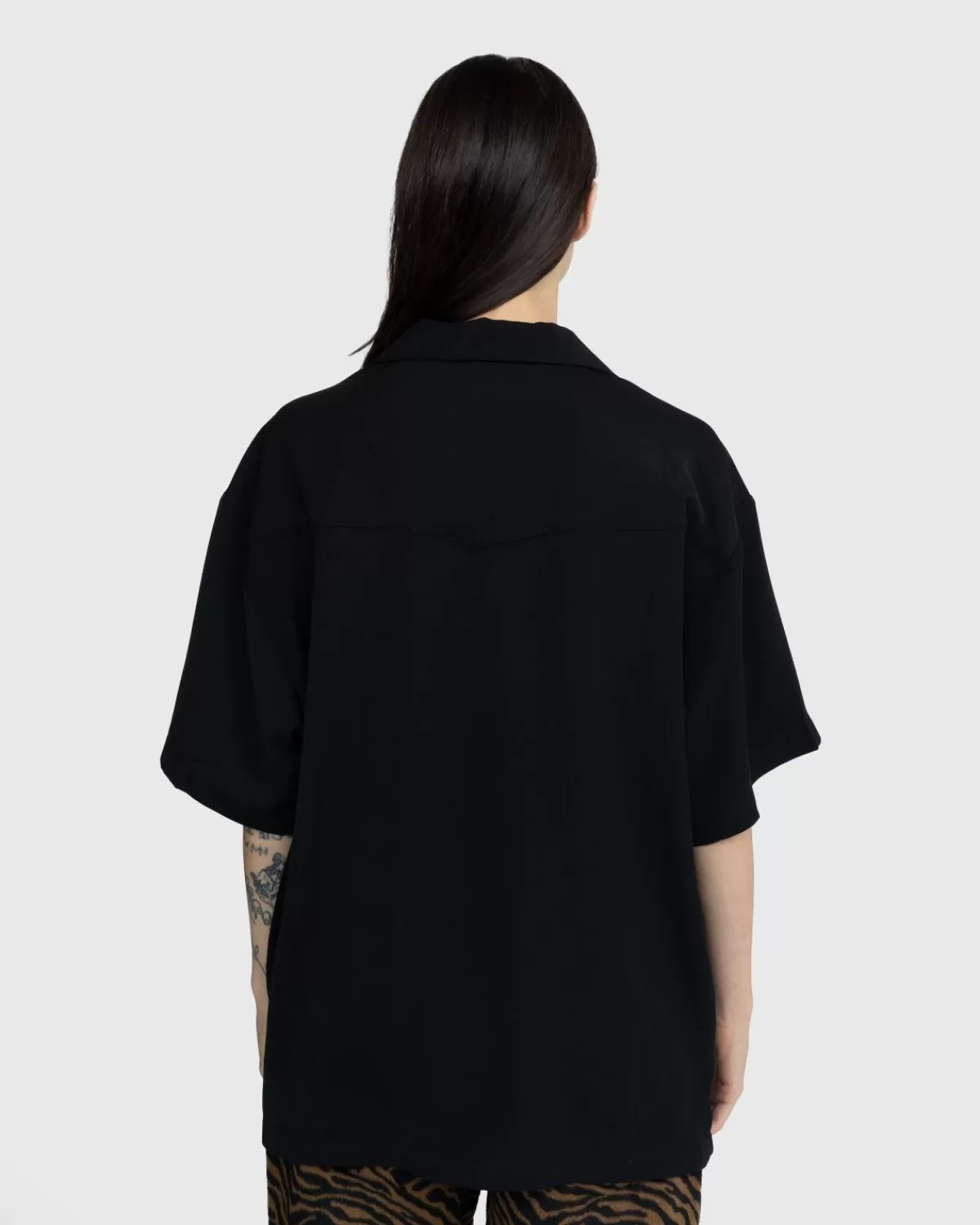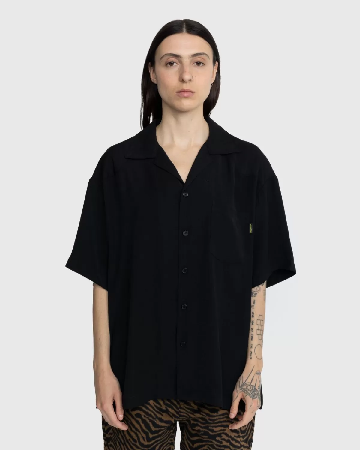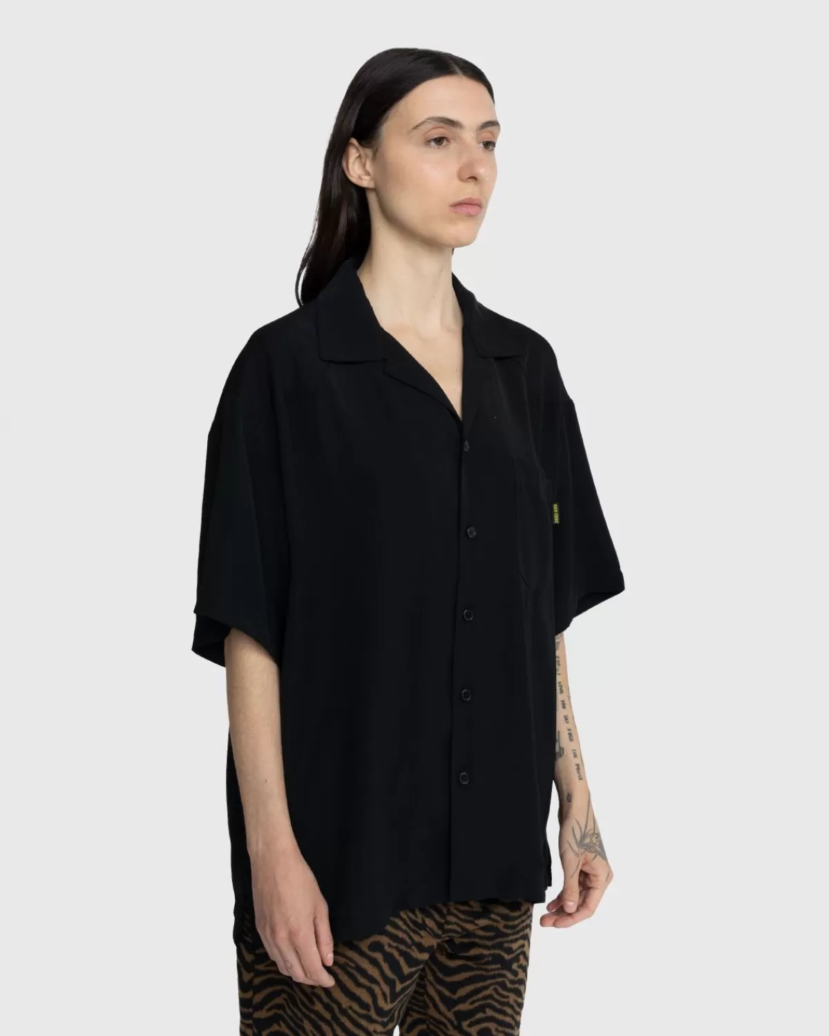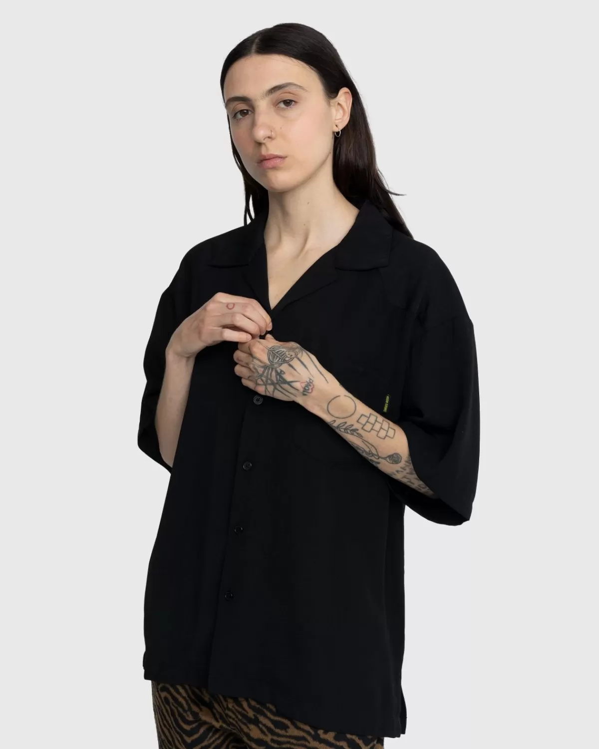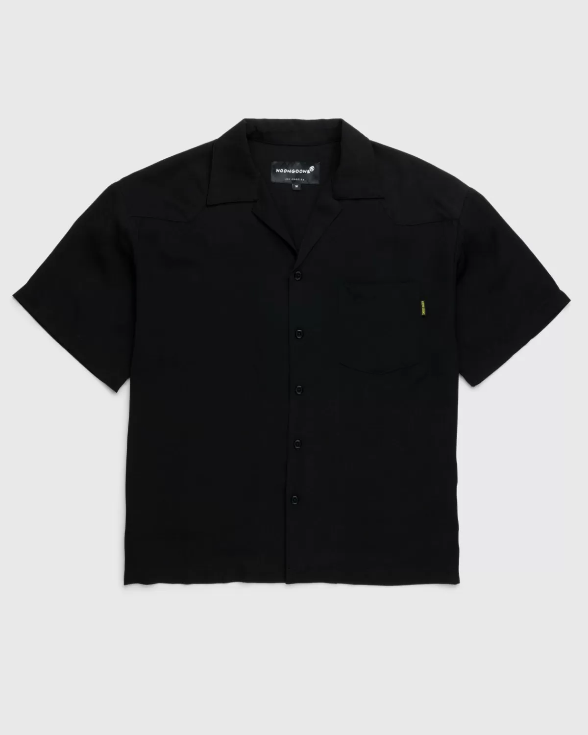 Het Kickback Shirt Is De Variant Van Noon Goons Op Het Klassieke Overhemd Met Kampkraag. De Button-Down Met Korte Mouwen Is Gesneden Voor Een Iets Oversized Pasvorm En Heeft Puntige Details Aan De Voorkant, Jukken Aan De Achterkant En Een Opgestikte Zak Op De Borst. Het Kledingstuk Wordt Geleverd In Een Onopvallende Geheel Zwarte Kleurstelling, Subtiel Gemerkt Met Een Klein Geweven Label Op De Zak.