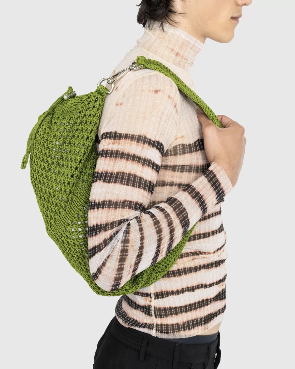 De 24H Hobo Sack Is Gemaakt Van Met De Hand Gehaakt Egyptisch Katoen In Italië En Bevat Praktische Details Zoals Een Metalen Koordsluiting, Een Ingebouwd Vak Met Ritssluiting En Een Metalen Karabijnhaak Aan De Sleutelhanger Die Aan De Riem Is Bevestigd. Het Italiaanse Label Ssu Maakt Gebruik Van Technische Uitrusting En Uniformen En Herschept Praktische Vormen Van Handgemaakte Breisels En Haakwerk. Door Een Nieuwe Context Te Geven Aan Traditionele Breitechnieken, Is Het Gespecialiseerd In Tassen En Accessoires Zoals Deze Gebreide Zak.