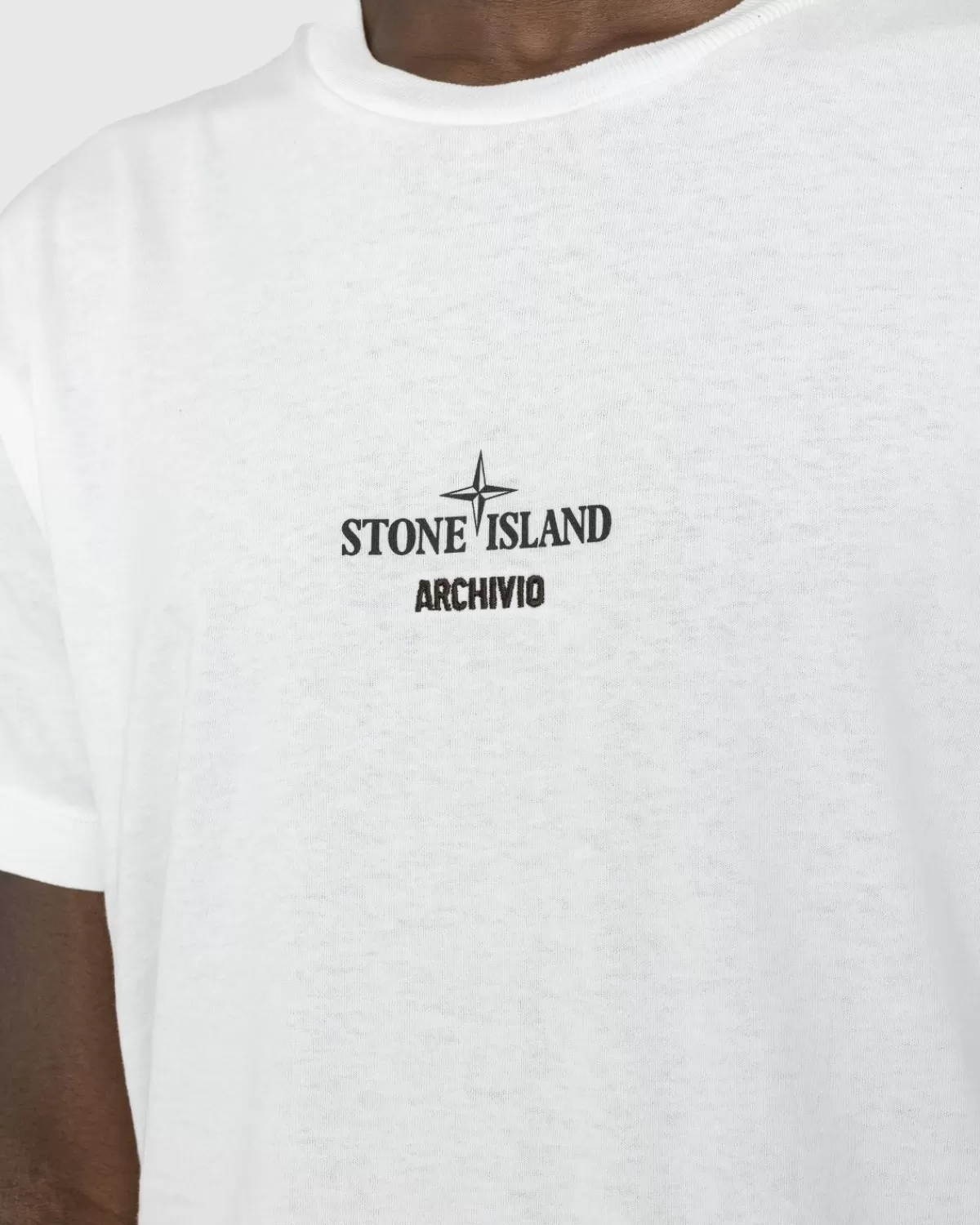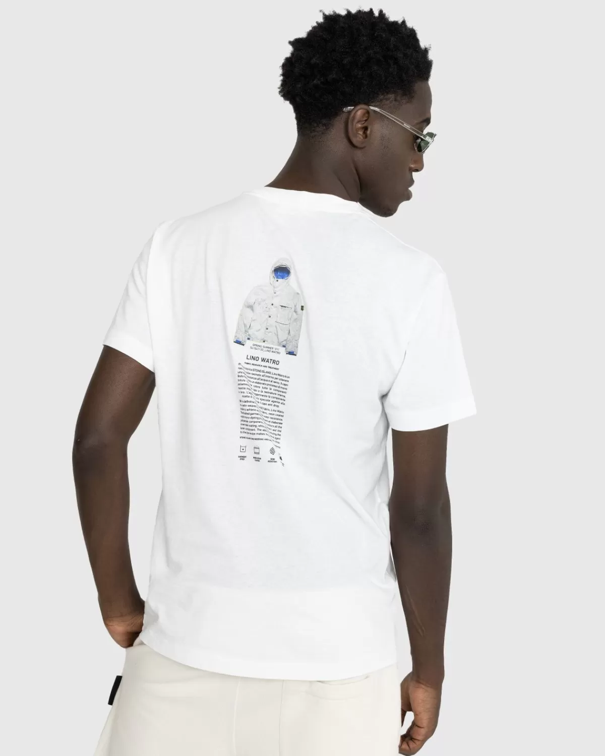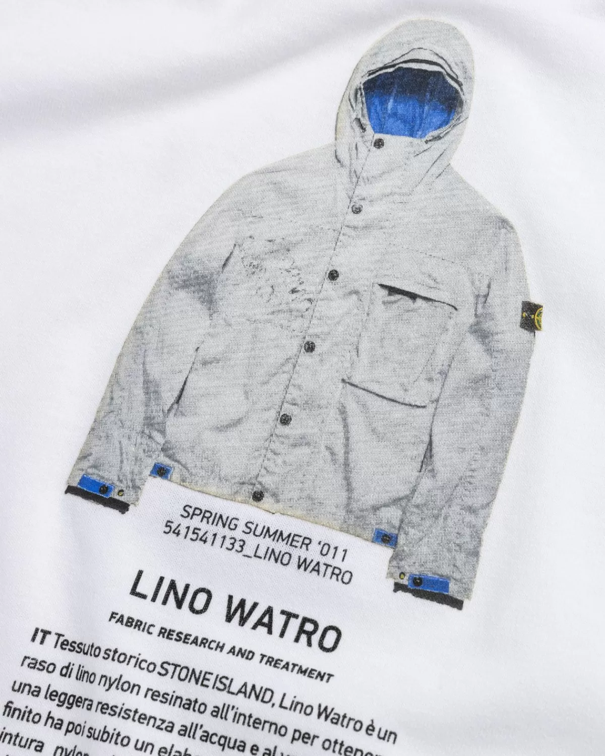 Het Archivio-Project Van Stone Island Is Ontworpen Om De Liefde Van Het Merk Voor Experimenteren En De Innovatieve Kracht Van Het Merk In De Textielindustrie Onder De Aandacht Te Brengen. Een Van De Nieuwste Archivio-Stukken, Het Lino Watro T-Shirt, Is Gemaakt Van Een Lichtgewicht Katoenen Jerseystof. De Voorkant Van Het T-Shirt Is Versierd Met Het Stone Island-Logo En Archiefborduurwerk, Terwijl Op De Achterkant Een Foto Van Een Gearchiveerd Kledingstuk Te Zien Is.