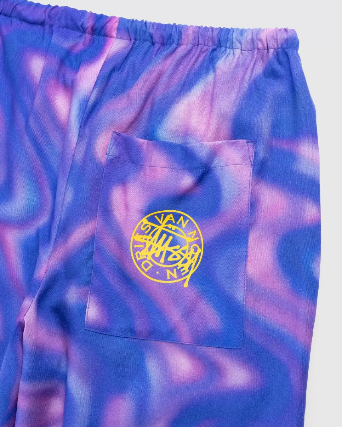 Twee Labels Die Verschillende Ruimtes In De Modewereld Bezetten, Het Nederlandse High-End Label Dries Van Noten En Het Amerikaanse Streetwear Og Stüssy, Hebben In Een Onverwachte Maar Welkome Samenwerking Een Gemeenschappelijke Basis Gevonden In Hun Liefde Voor Luide Prints. Deze Short Laat De Twee Labels Zien Die Volop Experimenteren Met Felle Kleuren Door Middel Van Een Psychedelische Paarse, Blauwe En Roze Print Die Overal Te Zien Is. En Alsof Dat Nog Niet Genoeg Is, Zijn Er Gele Collaboratieve Logodetails Op De Achterzak.
