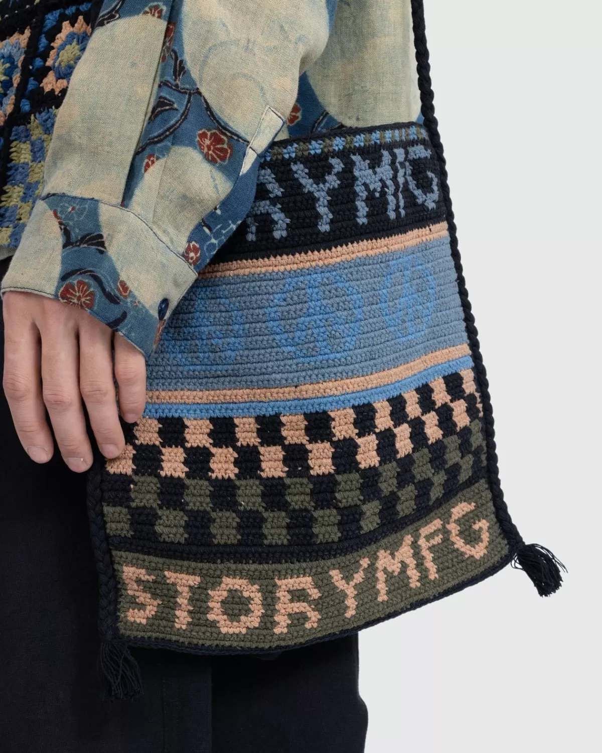 De Stash Bag Van Story Mfg. Is Natuurlijk Geverfd Met Indigo, Boomschors En Verschillende Wilde Planten En Is Met De Hand Gehaakt Met Garen Van Biologisch Katoen. De Stash Bag Is Versierd Met Logo’S En Het Vredesteken-Embleem Van Het Merk En Heeft Het Perfecte Formaat Voor Wandelsnacks, Waardoor Hij Een Ideale Kandidaat Is Voor Je Dagelijkse Tas.
